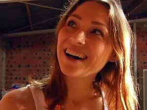 Une mignonne excitée taquine et baise son vieux voisin dans le hangar
